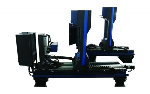 該套設備是我公司為中國石油集團渤海鉆探工程有限公司研制的鉆桿專用測量設備,設備分為外螺紋側測量裝置和內螺紋側測量裝置兩部分。其中外螺紋部分設置2組雙測頭,測量鉆桿接頭外徑尺寸,同時通過測頭部分滑臺的行走距離和尺寸變化設定,測量外螺紋部分接頭的長度。內螺紋部分設置2組雙測頭和1只二維激光測量傳感器,雙測頭測量鉆桿接頭外徑尺寸,同時通過測頭部分滑臺的行走距離和尺寸變化設定,測量內螺紋部分接頭的長度。二維激光測量傳感器掃描測量內螺紋端部的壁厚尺寸。